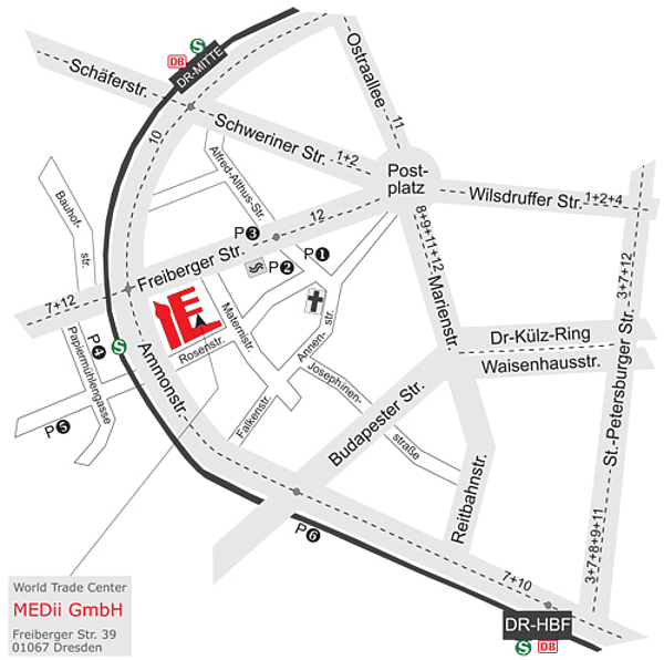 Sonderkonditionen der MEDii GmbH: Weiterhin können wir Ihnen Parkmöglichkeiten in der Tiefgarage des World Trade Center (siehe Anfahrtsbeschreibung) für einen Sonderpreis von 5,00 Euro pro Tag zur Verfügung stellen. Dieser Preis gilt auschließlich bei Bezahlung Ihres Parktickets am Info-Punkt des World Trade Center.